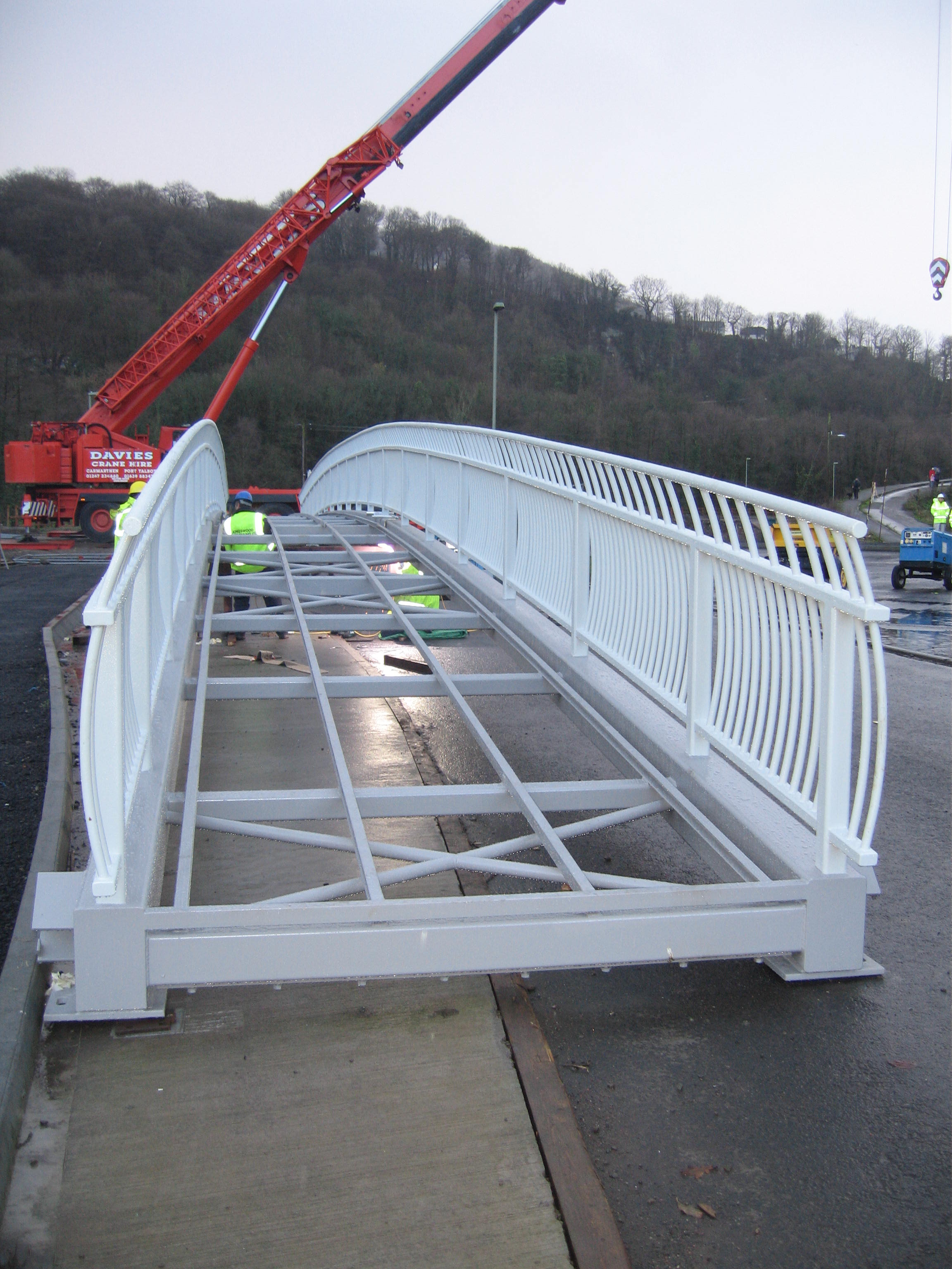 Merriman Construction with Caerphilly County Borough Council awarded Kingswood Engineering the contract to fabricate, paint and erect a pedestrian footbridge linking a new housing development with the town of Abercarn.